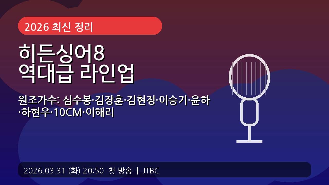 2026년 기대작 히든싱어8 역대급 라인업이 공개됐습니다. 원조가수(심수봉·김장훈·김현정·이승기·윤하·하현우·10CM·다비치 이해리)와 첫 방송 일정, 모창 지원 방법까지 한 번에 정리해드려요.