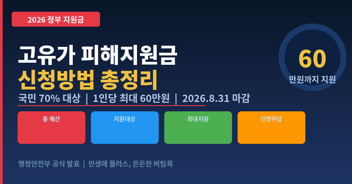 2026 고유가 피해지원금이 본격 시행됩니다. 대상은 국민 70%, 1인당 10만~60만 원까지 차등 지급되며 신청기간, 사용처, 카드·상품권 신청방법까지 한 번에 정리했습니다.